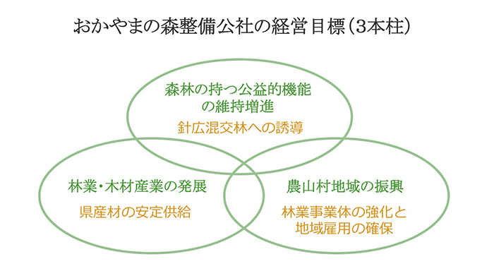 育林事業、収穫事業を長期的かつ計画的に推進し、林業事業体の強化と林業就業者の定着を促進することにより、農山村地域の振興に貢献します。